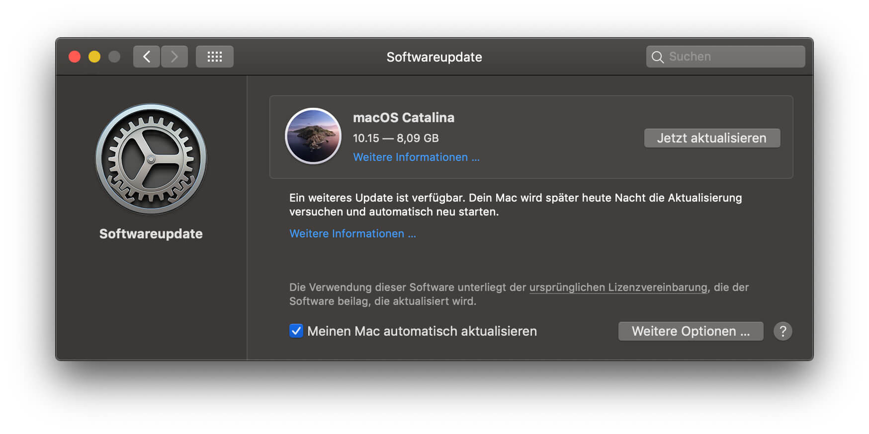 Seit Anfang des Monats können Nutzer/innen von kompatiblen Macs selbige auf macOS 10.15 Catalina aktualisieren. Wer sich noch nicht mit dem Upgrade beschäftigen will, muss es aber wahrscheinlich trotzdem tun: denn immer wieder wird der Hinweis angezeigt, dass das Betriebssystemupdate bereitsteht und installiert werden kann. Zudem wird in den Systemeinstellungen mit einem roten Hinweis-Kreis auf ein Softwareupdate hingewiesen. Wie ihr die nervige Benachrichtigung und den Hinweis in der Signalfarbe abschalten könnt, das habe ich euch an dieser Stelle zusammengefasst.