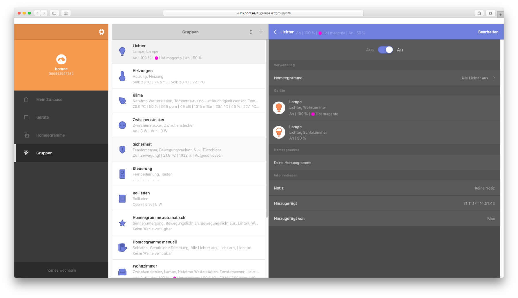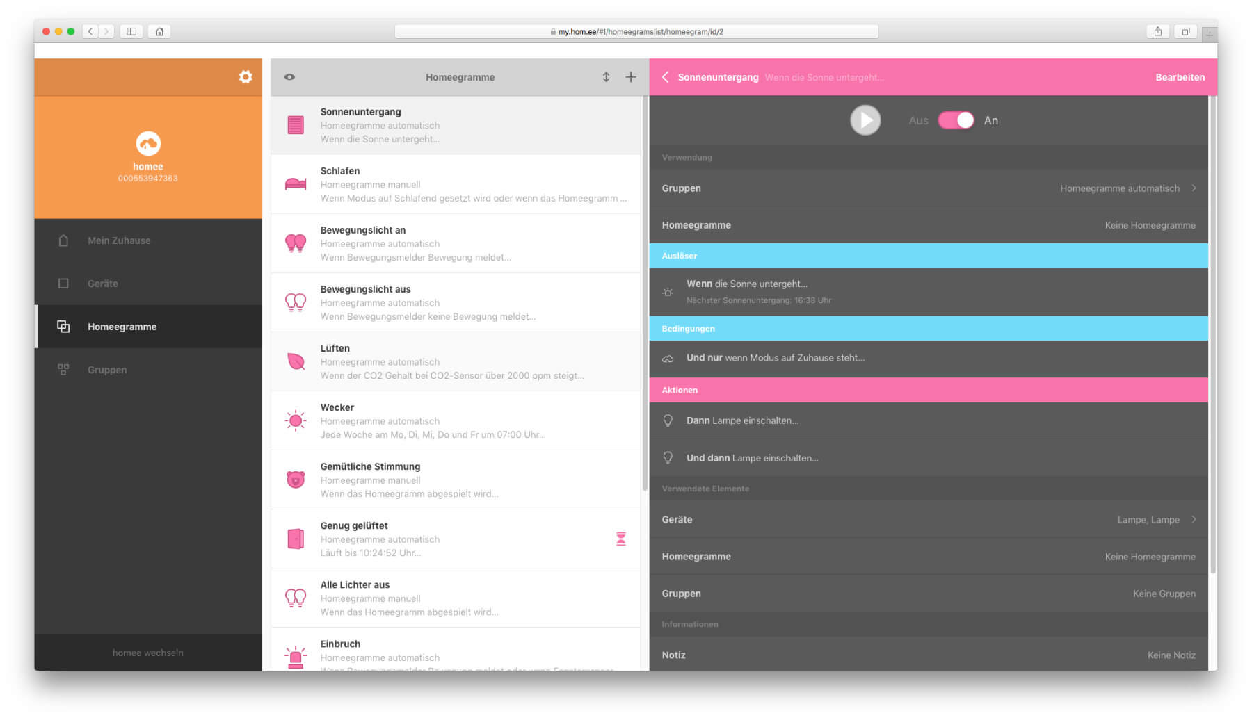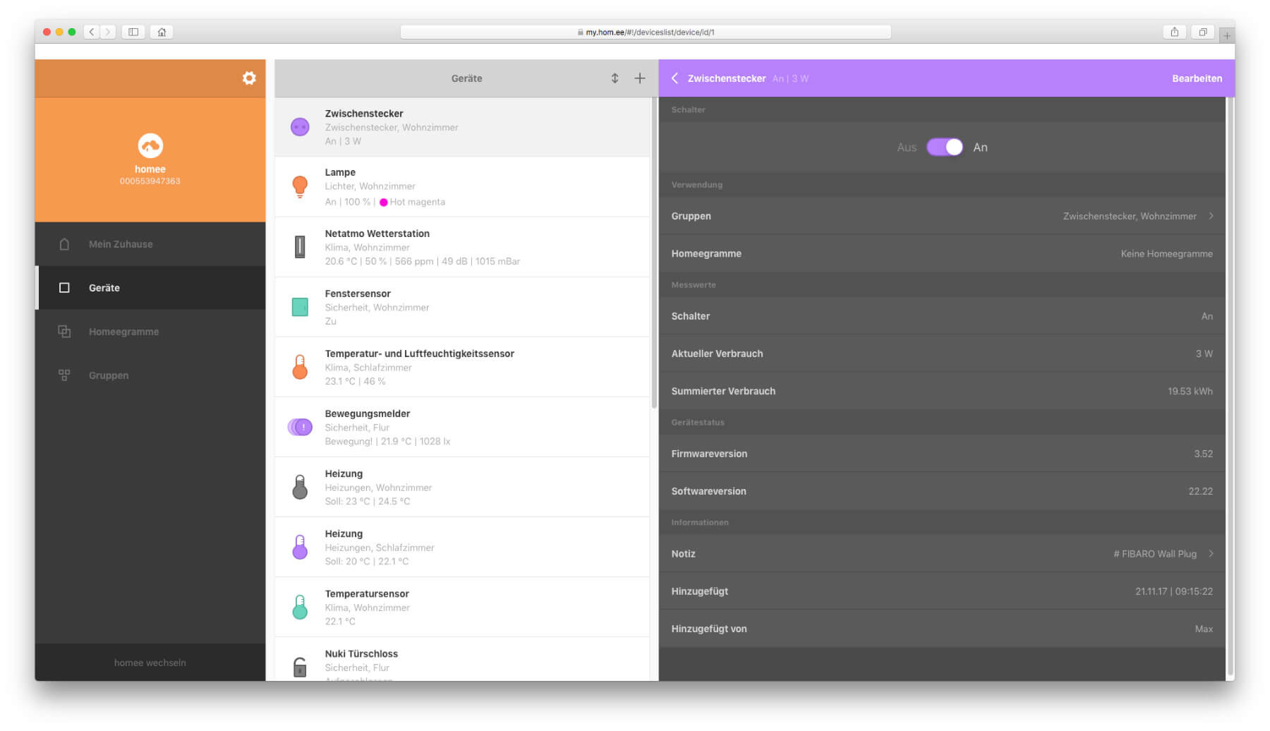 Besucht man die Webseite https://my.hom.ee, so sieht man vorerst eine Login-Maske, mit der man ohne ein Nutzerkonto nicht viel anfangen kann. Klickt man jedoch auf den grauen „Demo Modus“-Knopf, dann bekommt man einen Einblick in die Möglichkeiten, die sich bei der Nutzung des Systems auftun. Hier ein paar Screenshots der Demo (Anklicken zum Vergrößern):