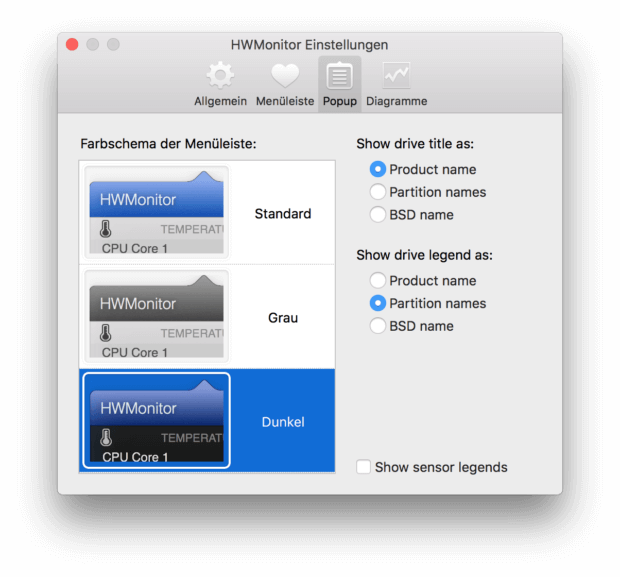 - Menüleiste: Hier könnt ihr auswählen, welche Werte und Symbole in der Menüleiste angezeigt werden sollen. Ähnlich wie bei iStat Menus oder dem Systemmonitor können so jederzeit die Werte im Auge behalten werden.