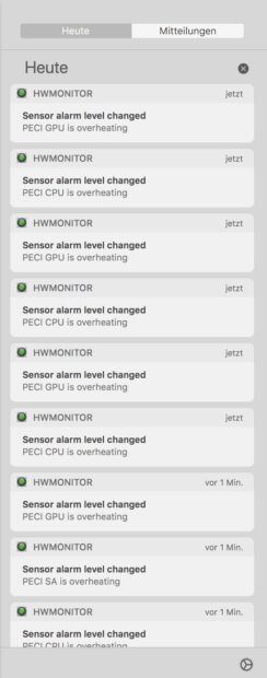 Es ist immer gut zu wissen, wann der Rechner überhitzt oder in anderer Art an seine Grenzen stößt. Könnt ihr ihm aber gerade keine Pause gönnen, die Belastung abschwächen oder eine zusätzliche Kühlung realisieren, dann bleibt er eben über einen gewissen Zeitraum am Limit. Passiert dies mit aktivierten Benachrichtigungen des HWMonitors, dann kommt eine Push-Nachricht nach der anderen. Muss die Arbeit also gerade fertig werden und ihr könnt die kleinen Fenster oben rechts nicht mehr ertragen, dann stellt die Notifications in den Einstellungen unter „Allgemein“ aus. Sobald die Arbeit getan ist, kann sich der Mac dann ja ausruhen.