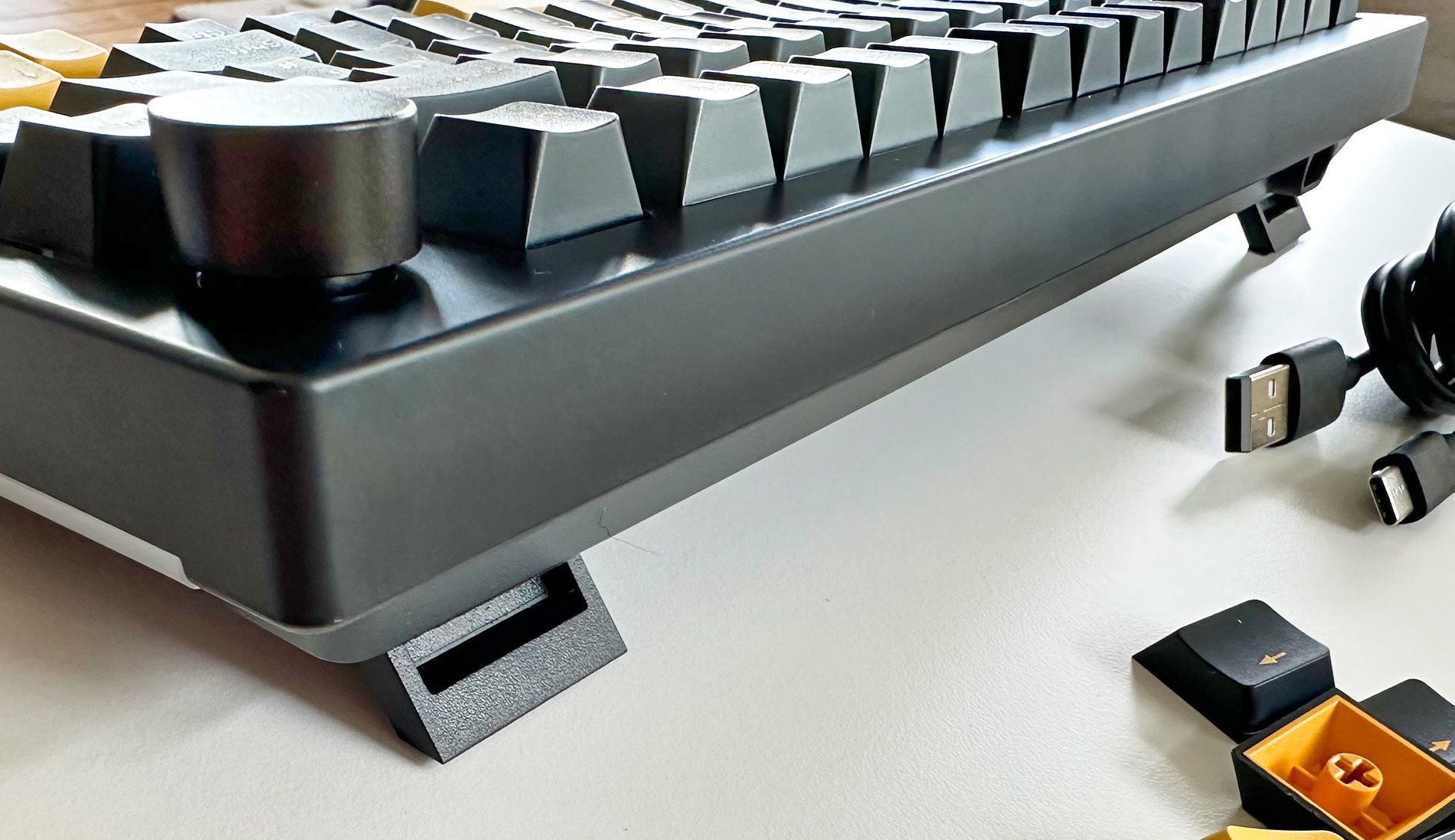 - Die Tastatur funktioniert nur kabelgebunden per USB. Im Lieferumfang ist aber leider nur ein USB-C-auf-USB-A-Kabel, sodass sie nicht ohne eigenes USB-C-Kabel an neue Macs angeschlossen werden kann.