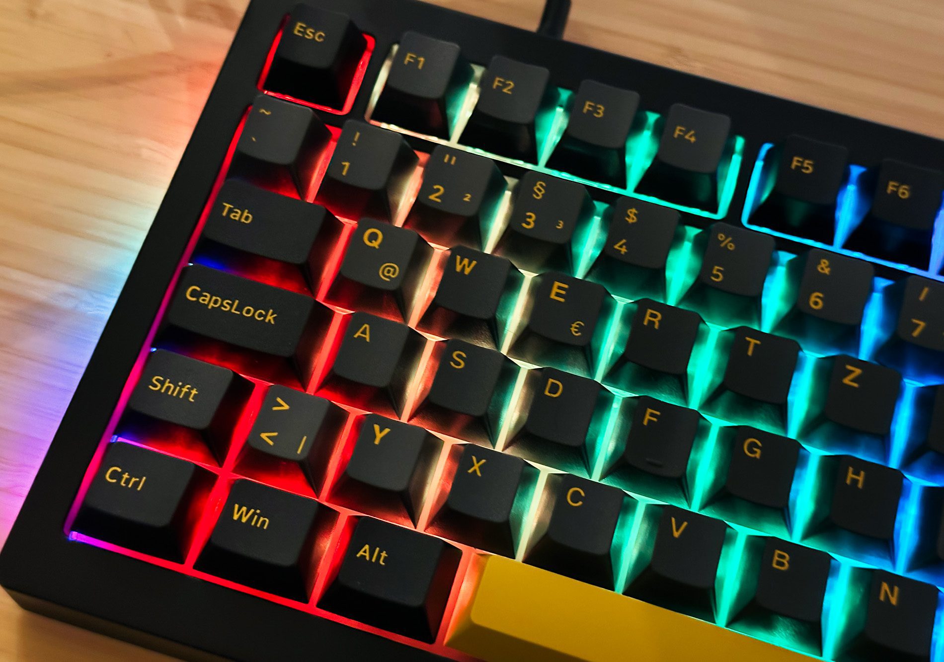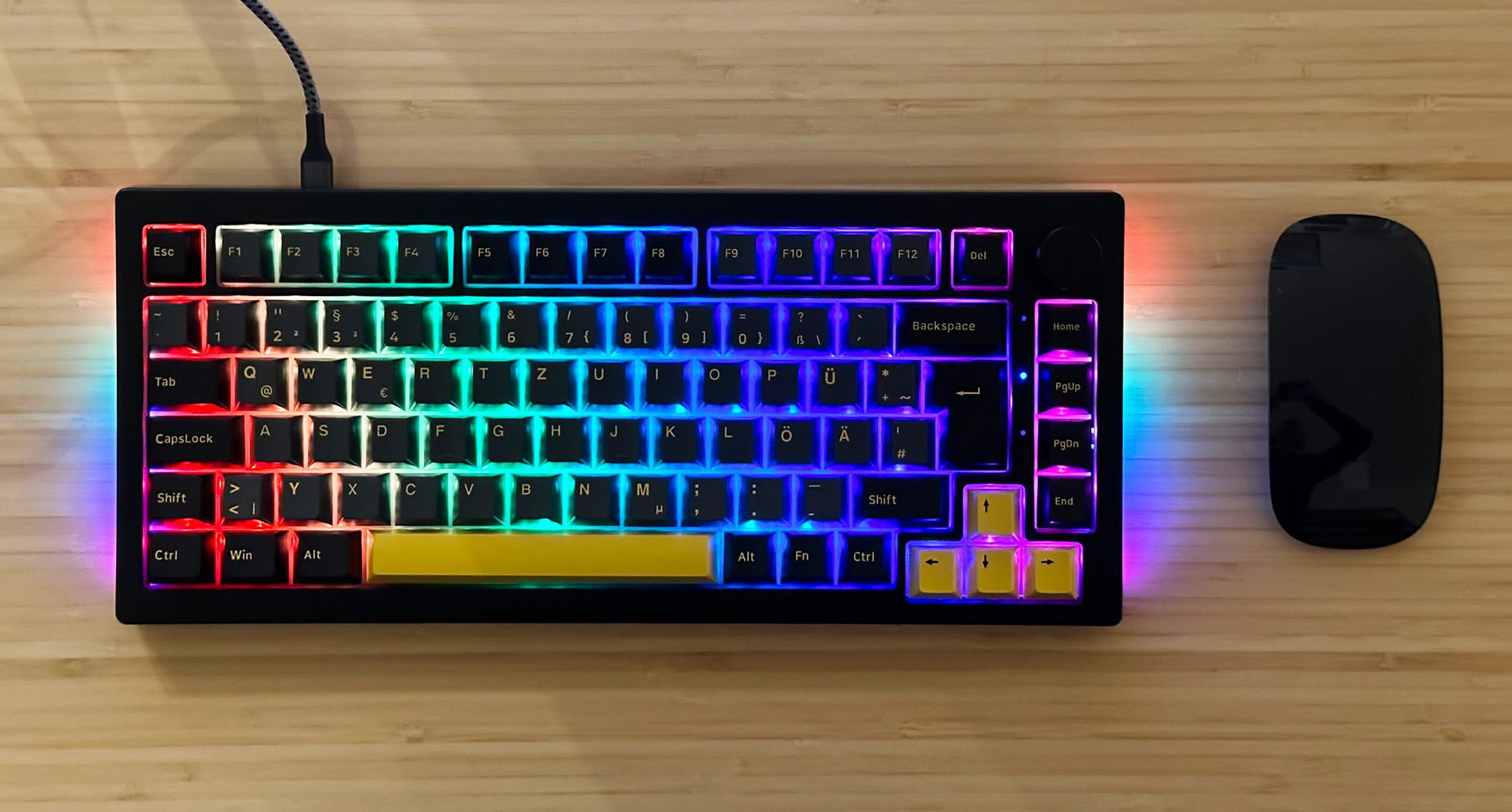 - Das Layout ist recht kompakt und wird 75%-Tastatur genannt, da wir keinen Nummernblock rechts haben.