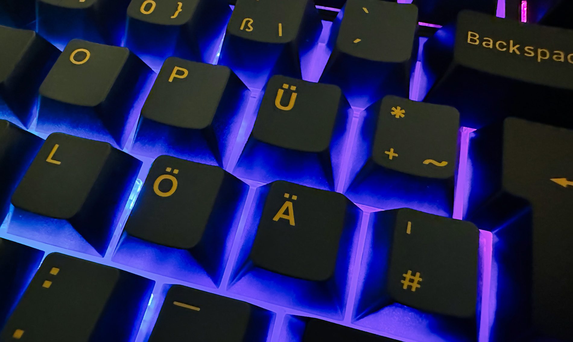 - Die Beschriftung der Tasten ist im Double-Shot-Verfahren (Doppelschussspritzguss) angebracht. Das bedeutet, dass die zwei Farben tatsächlich aus Materialien mit zwei unterschiedlichen Farben hergestellt werden und man auch nach Jahren noch die Beschriftung lesen kann, weil sie quasi durch die komplette Tastenoberseite geht. Es ist die hochwertigste Art, in der man die Legenden auf den Keycaps anbringen kann.