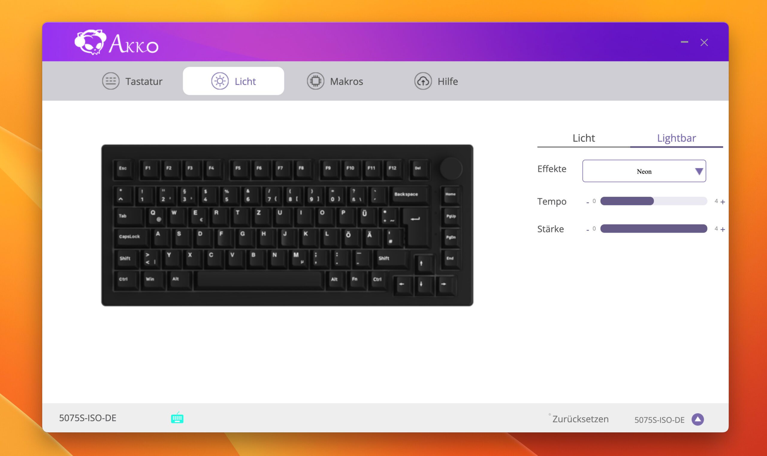 Mit den Makros habe ich kurz rumprobiert, aber leider nur ein Makro aufzeichnen können, das ich dann aber nicht abrufen konnte. In einer technischen Beschreibung der Akko 5075S habe ich dann gelesen, dass sie scheinbar die Makro-Funktion nicht unterstützt. Wenn dies der Fall ist, hätte man den Bereich Makros in der App eventuell ausblenden sollen, um möglicher Verwirrung vorzubeugen.