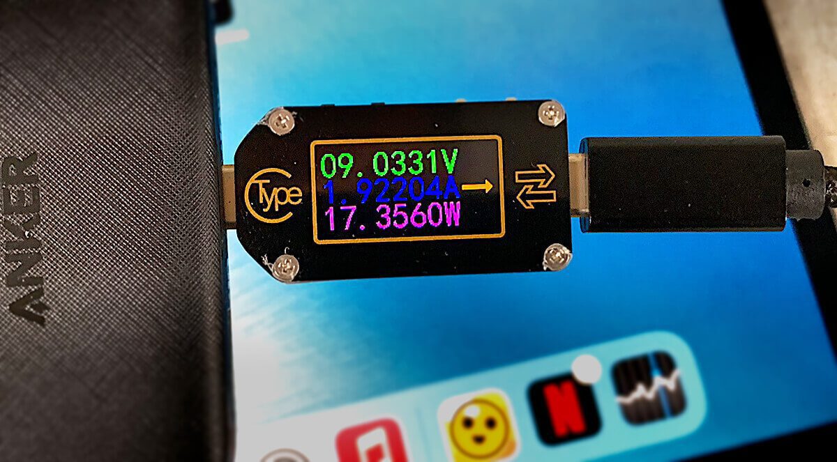 Das iPad Pro (12,9 Zoll) ließ sich ebenfalls mit der Anker Powerbank. Hier kam ich auf eine Leistung von 17 Watt (bei 9 Volt). Mit 9 Volt hat die Powerbank also die maximale Spannung ausgeliefert und sorgt dafür, dass das große iPad flott aufgeladen wird. Schneller geht es nur, wenn man ein USB-C Netzteil mit Power Delivery hat, das 15 Volt liefert. Dann nimmt sich das iPad Pro laut meinen Messungen bis zu 23 Watt und ist noch etwas zügiger aufgeladen.