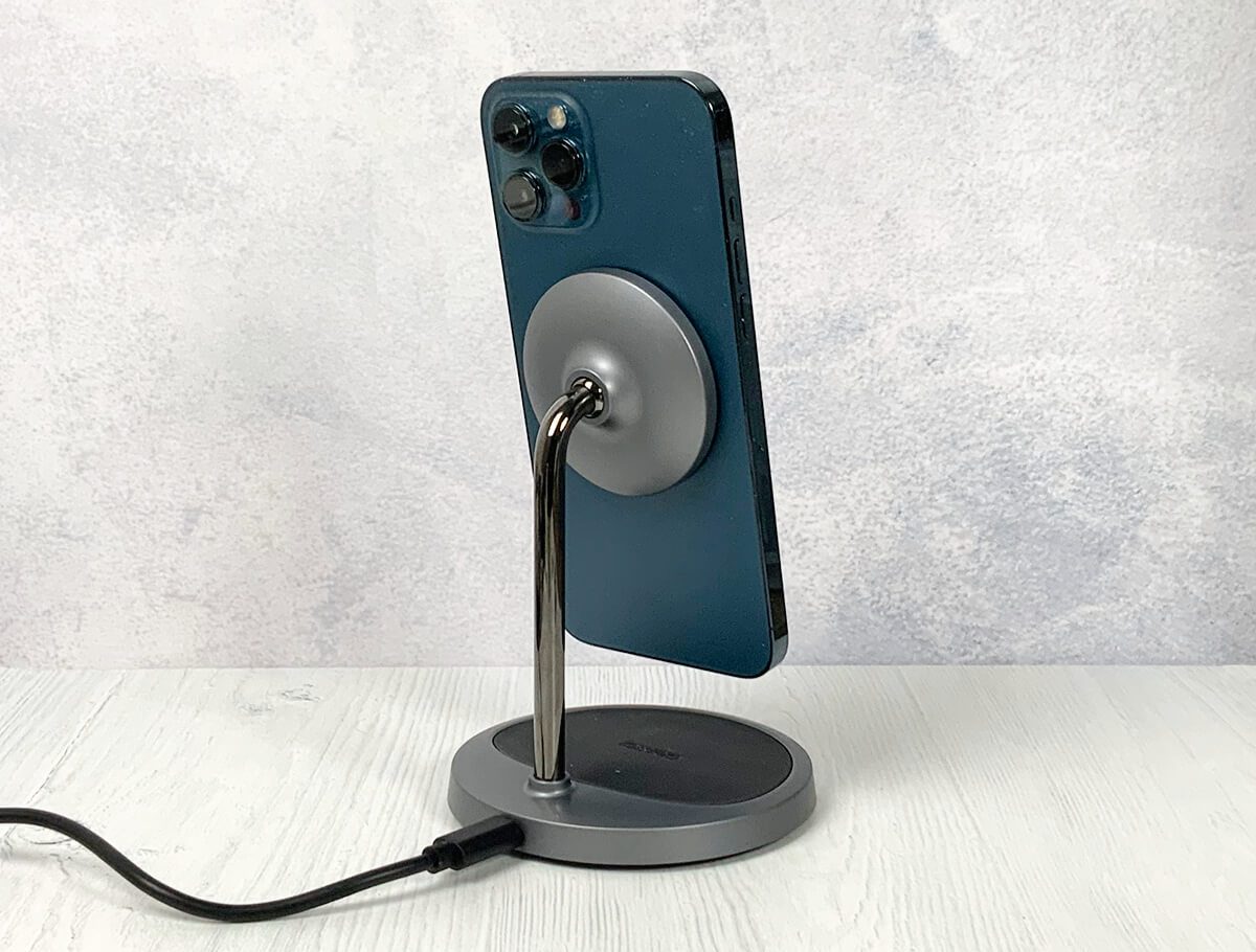 Der Choetech Magnet-Ladeständer wirbt in den technischen Daten mit 15 Watt Leistung, was wir bereits von den MagSafe-Ladepucks kennen. Und tatsächlich unterstützt der Lade-Stand auch den MagSafe-Standard von Apple und kann iPhone 12 Modelle damit besonders schnell kabellos laden.