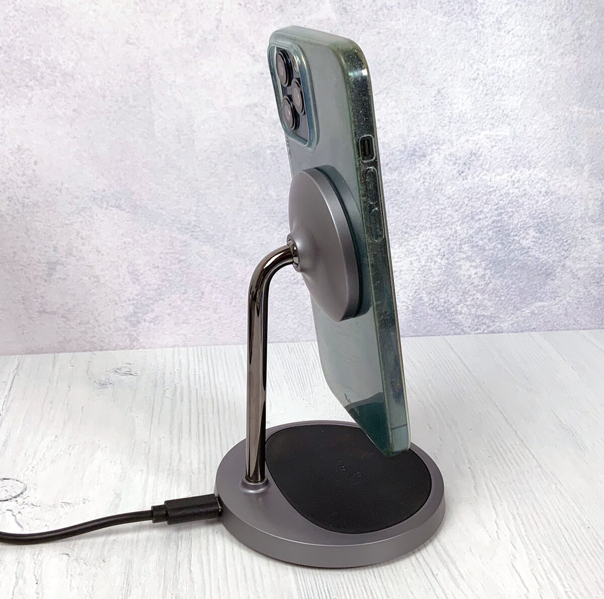 Ein praktisches Detail für den Alltag habe ich erst nach einer Weile festgestellt: Man kann den Winkel, in welchem das iPhone ausgerichtet ist, in einem Bereich von 45 Grad vertikal verstellen. Damit lässt sich das iPhone für Videokonferenzen perfekt ausrichten und man muss es nicht ständig in der Hand halten.