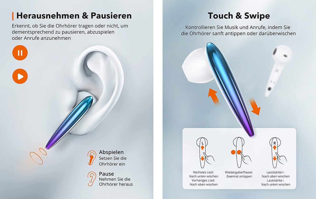 - Pause/Wiedergabe: 2x tippen am linken oder rechten Ohrhörer