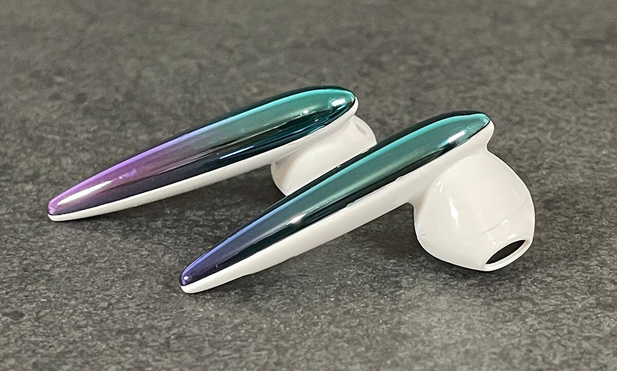 Die Optik mit dem bunten, glänzenden Streifen am „Stiel“ der Ohrhörer ist mir persönlich ein bisschen zu viel Dekor, aber das ist eine subjektive Sache und sicher gibt es etliche Männer und Frauen, die diese Färbung gut finden. Ich mag eher schlichte Eleganz und hätte mir ein durchgehendes Weiß gewünscht.