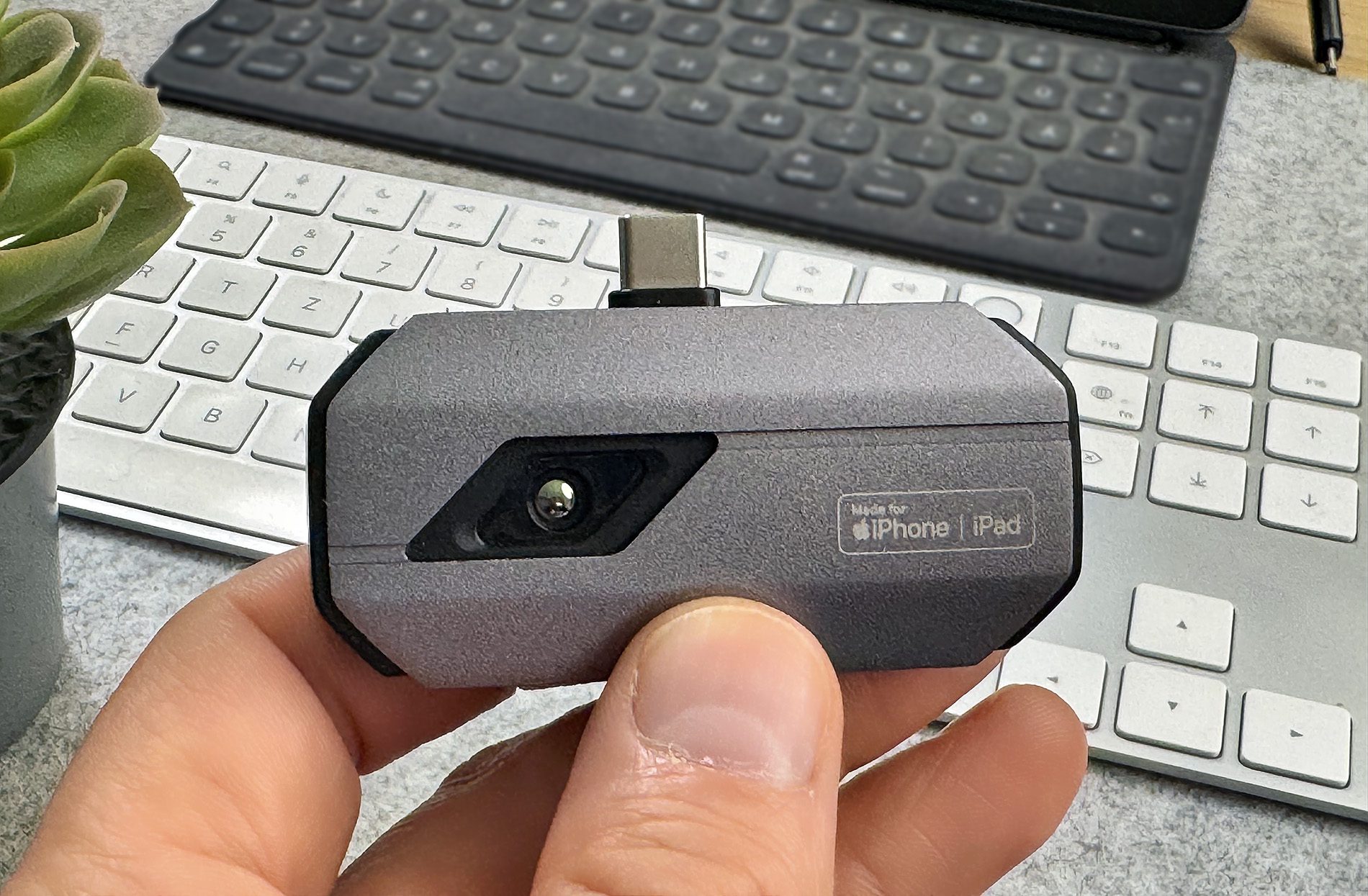 Im Grunde ist es ein kleines Kameramodul mit USB-C-Stecker, das man direkt in den Ladeport des iPhone stecken kann. Über die App "TopInfrared" kann man die Wärmebildkamera dann nutzen und Bilder oder Videos erstellen, die das Infrarotspektrum darstellen.