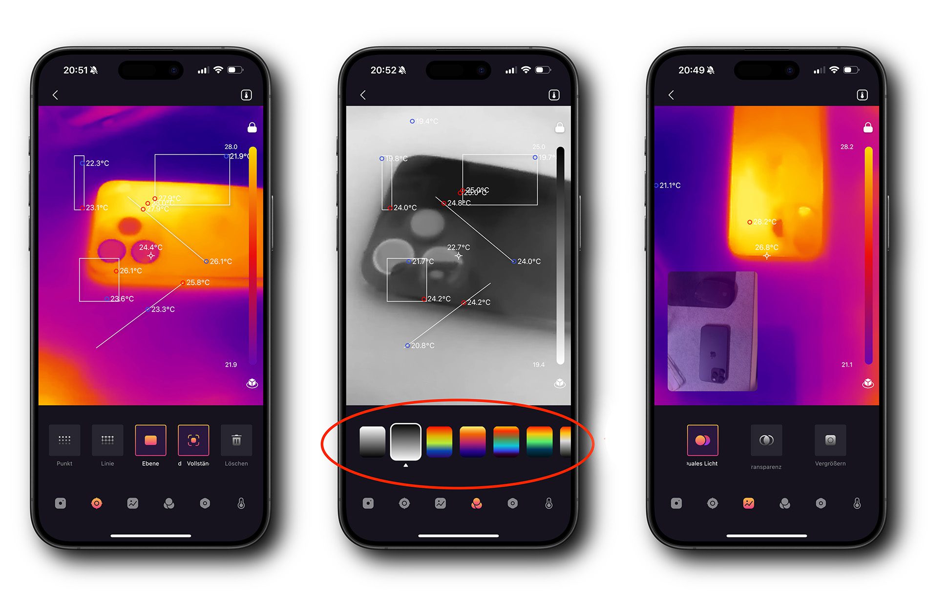 - Für professionellere Anwendungen gibt es die Möglichkeit, verschiedene Farbpaletten einzustellen, Reports zu erstellen, das normale Kamerabild einzublenden und Messbereiche mit Kreisen, Rechtecken und Linien anzulegen, in denen dann die höchste und niedrigste Temperatur angezeigt wird.