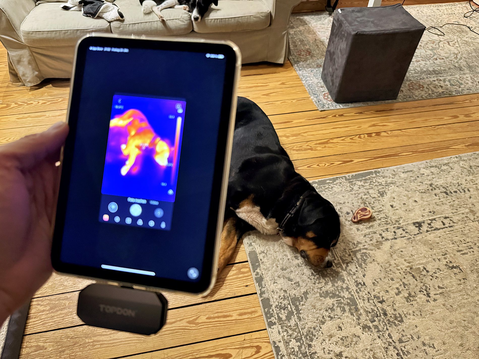 Einen kleinen Wermutstropfen gibt es dennoch: Die iPhone-App ist mittlerweile in Version 2 erschienen, aber es gibt immer noch keine iPadOS-App. Das heißt, man kann die TOPDON Kamera zwar am iPad nutzen, aber man sieht nur einen kleinen iPhone-Ausschnitt auf dem Display. Den kann man zwar per Button vergrößern, aber das tollste Erlebnis ist es nicht.