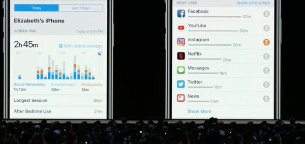 - Screen Time: Übersichten zur wöchentlichen Nutzung des Geräts mit Anzeige, welche Apps wie oft und lange genutzt werden bzw. wie oft in der Stunde man das iPhone zur Hand nimmt und wegen welcher App