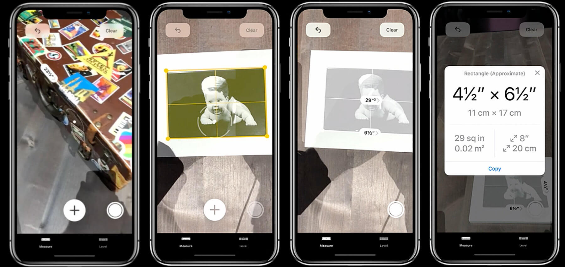 „Apple Measure“ heißt die App aus Cupertino, die dazu dienen soll, mit der iPhone-Kamera Objekte auszumessen. Craig Federighi demonstrierte die Anwendung, mit zugegeben nicht neuem Konzept, an einem Koffer und einem Bild in einem Bilderrahmen. Bei letzterem wurde die Rechteck-Form direkt erkannt, die Seiten wurden ausgemessen und die Ergebnisse aufgelistet angezeigt.