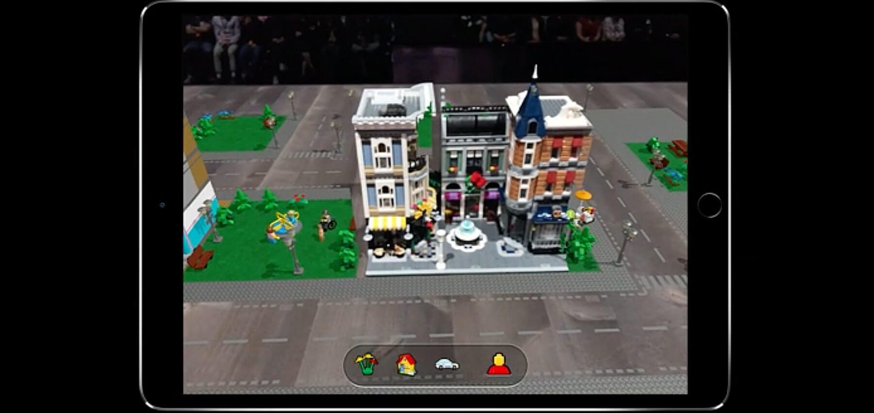 Ein weiteres Beispiel für AR auf dem iPad haben wir letztes Jahr schon einmal gesehen: Spiele. Mit ARKit 2 sollen diese aber noch umfangreicher und für mehrere Nutzer sowie Zuschauer anwendbar sein. Apple stellte ein Spiel vor, bei dem die Spieler Gebäude aus Bauklötzern einschießen konnten. Dann kam Martin Sanders, Director of Innovation bei LEGO. Er zeigte, wie man echte LEGO-Sets per AR erweitern, mit Freunden spielen, eine halb-virtuelle Stadt mit Figuren und Quests aufbauen und diese sogar für später speichern kann.