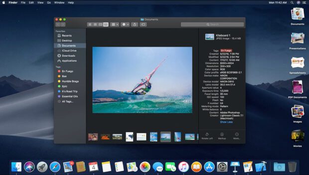 Auch der Finder soll mit macOS Mojave für mehr Ordnung sorgen. Es wird neben den aktuellen Ansichten (Liste, Symbole, Cover Flow) eine Galerie-Ansicht geben, in der es auf einer unteren Leiste Thumbnails geben wird - anders als die Liste bei Cover Flow. Zudem wird die Side Bar, die rechte Seitenleiste, nun alle Metadaten anzeigen können und es wird „Quick Actions“ geben. Quick Actions sind Buttons für voreingestellte oder selbst zugewiesene Befehle und Aktionen. Vor allem für die Fotobearbeitung kann das eine zeitsparende Abkürzung sein.
