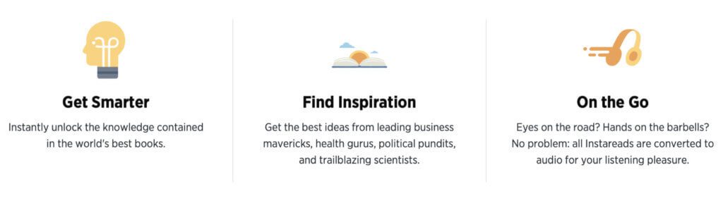 Instaread setzt auf eine einfache und intuitiv bedienbare Webseite sowie eine übersichtliche App für iOS und Android. Dabei werden die Cover der Zusammenfassungen schön gestaltet und auf eine Corporate Identity hin angepasst. Zudem gibt es eigene Instaread-Werke und auch Inhalte des New York Times Magazine. Insgesamt kommt Instaread dabei nach eigenen Angaben auf aktuell mehr als 800 Titel – zusammengestellt von 2016 bis 2019.