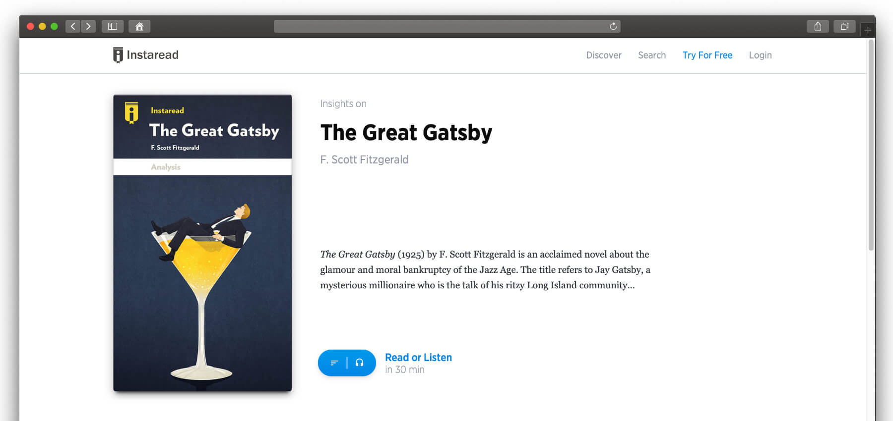 Als ich die Kategorie „Fiction“ auf der Instaread-Webseite entdeckte, hatte ich schon die Befürchtung, dass hier Romane eingedampft und somit ihrer Kreativen Essenz beraubt präsentiert werden. Aber anstelle einer gerafften Nacherzählung scheint es eine qualitativ hochwertigere Auseinandersetzung mit Titeln wie „To Kill A Mockingbird“ (Wer die Nachtigall stört), „Pride and Prejudice“ (Stolz und Vorurteil), „The Handmaid’s Tale“ (Der Report der Magd) oder „The Great Gatsby“ (Der große Gatsby) zu geben. Denn immerhin ziert das Wort Analysis die Cover der einzelnen Angebote. Für den letztgenannten Titel werden 30 Minuten für den Konsum der Literaturanalyse veranschlagt.