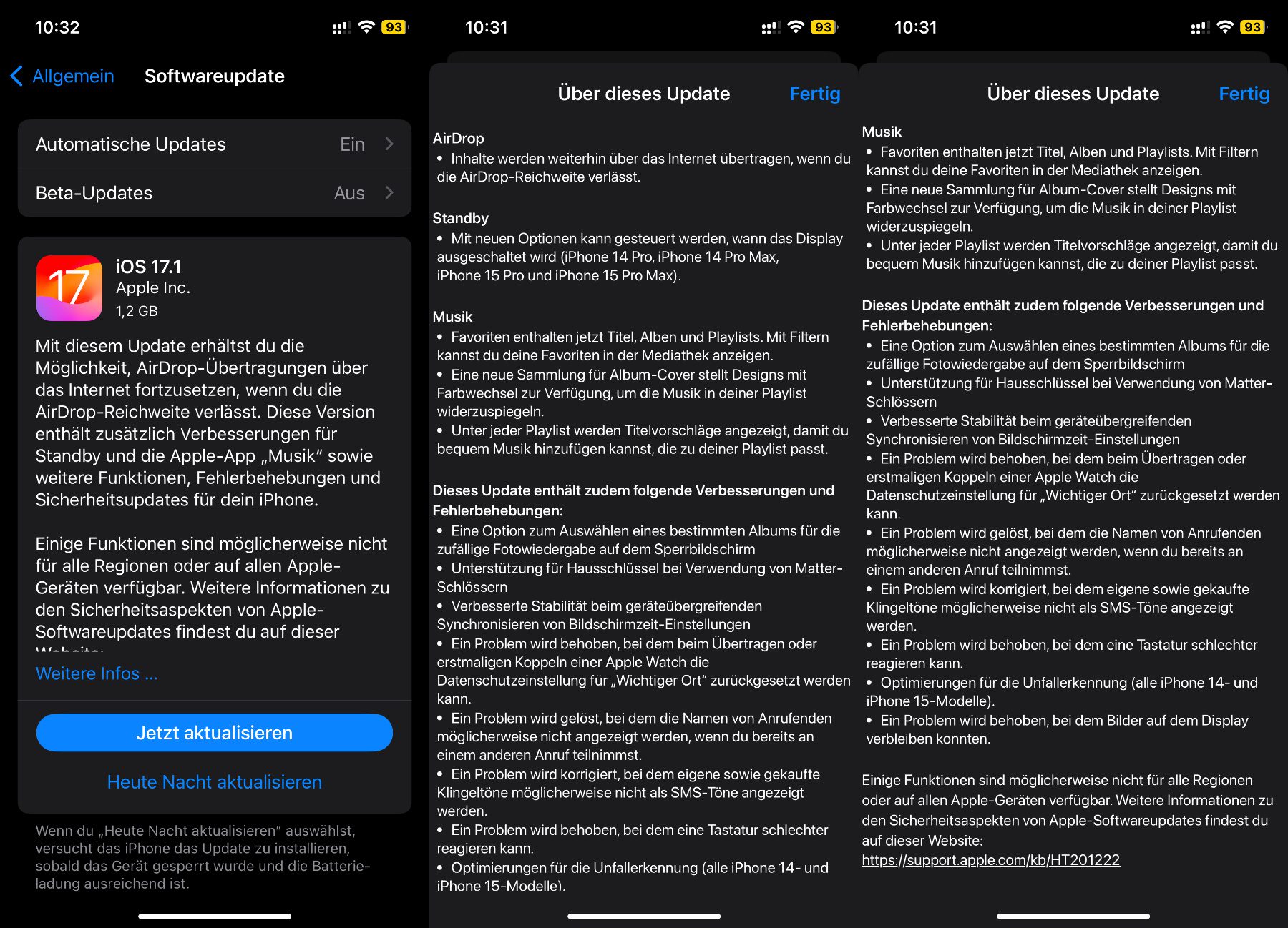 Für kompatible iPhones steht aktuell das Update auf die Betriebssystemversion iOS 17.1 bereits. Nach den schnellen Fixes von 17.0.1 bis 17.0.3 ist dies nun das erste wirklich geplante Update für Apple-Smartphones. Ihr findet die Update-Möglichkeit unter Einstellungen -> Allgemein -> Softwareupdate. Plant aber ein bisschen Zeit dafür ein, denn es werden 1,2 GB Inhalte geladen und installiert. Mit iOS 17.1 wird nun die per AirDrop begonnene Übertragung von Daten übers Internet fortgesetzt, wenn man sich aus der AirDrop-Reichweite bewegt. Zudem gibt es neue Standby-Einstellungen ab dem iPhone 14 Pro, Updates für die Musik App, etc.