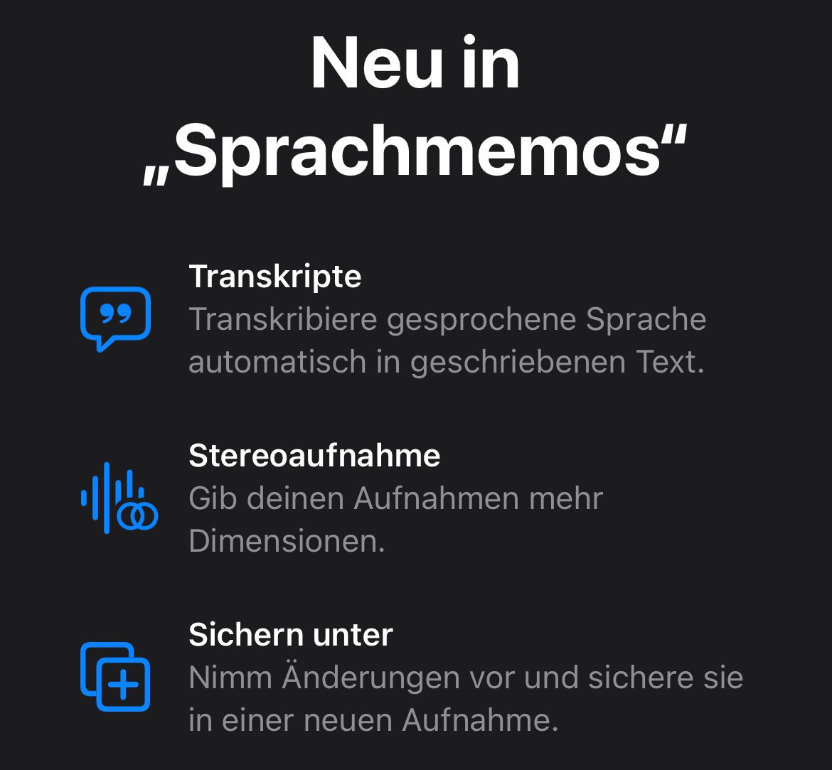 Ich habe mein iPhone vorhin auf iOS 18.2 aktualisiert und die Sprachmemos App gestartet, um zu schauen, ob auch abseits des iPhone 16, iPhone 16 Plus, iPhone 16 Pro und iPhone 16 Pro Max neue Features zu finden sind. Ich nutze übrigens ein iPhone 12 Pro, also gehen einige Neuerungen an mir vorbei. Dennoch wurde mir beim Öffnen von Sprachmemos angezeigt, dass es auch für ältere iPhones neue Funktionen gibt:
