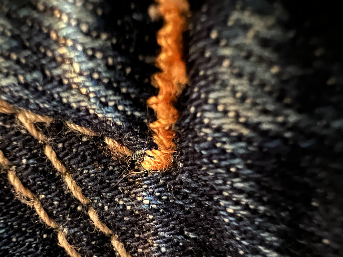 Die Frage ist nicht so einfach zu beantworten, da ich die Entfernung nicht genau gemessen habe. Ich schätze aber, es ist im Bereich von 1 bis 2 cm. Auf dem folgenden Foto ist eine Naht meiner Jeans zu sehen, die in etwa ein Zentimeter lang ist. Man kann also sehr nah ran. Mit meinem iPhone 12 Pro Max muss ich etwa 15 bis 20 Zentimeter Abstand halten. Solche Makroaufnahmen sind damit vollkommen unmöglich.