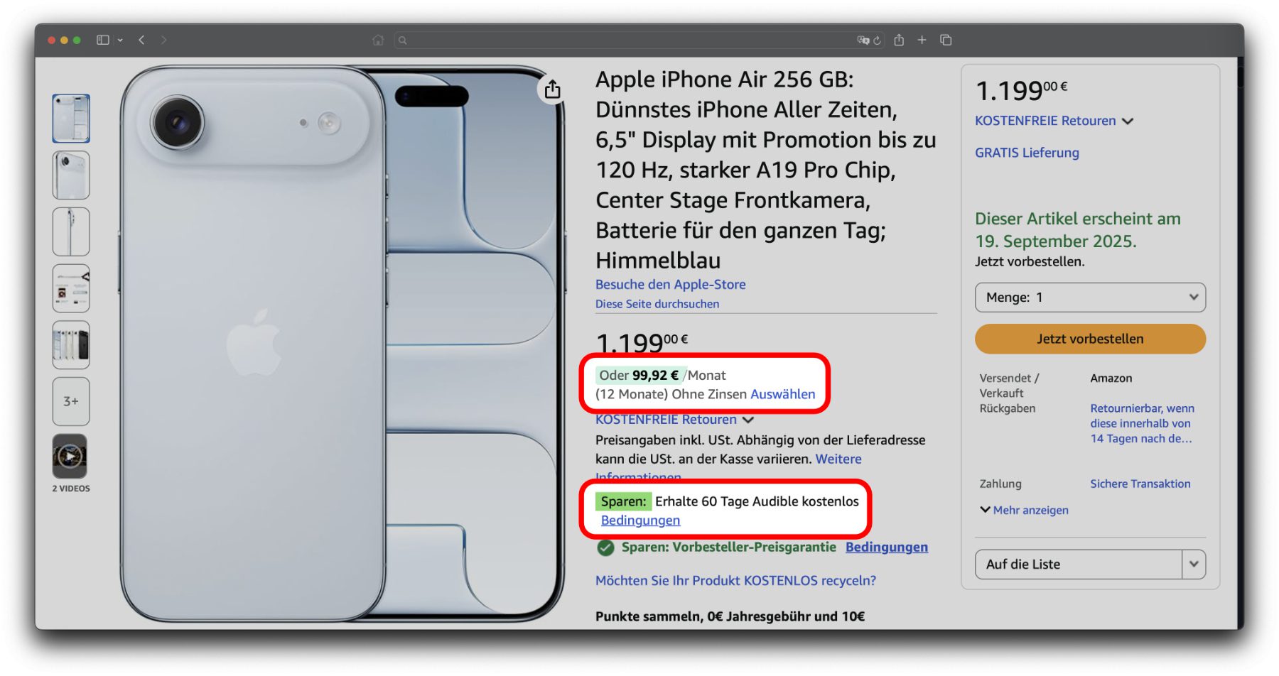 Das neue iPhone Air ist das bisher dünnste Apple-Smartphone. Dennoch steckt einige Pro-Power in dem Gerät. Wer es kaufen möchte, aber nicht sofort den vollen Preis bezahlen will, kann es über eine Finanzierung erwerben. Den Apple iPhone Air Ratenkauf gibt es z. B. bei Amazon, und das mit zwölf zinsfreien Raten. Ein weiterer Vorteil: Es gibt 60 Tage Audible gratis dazu.