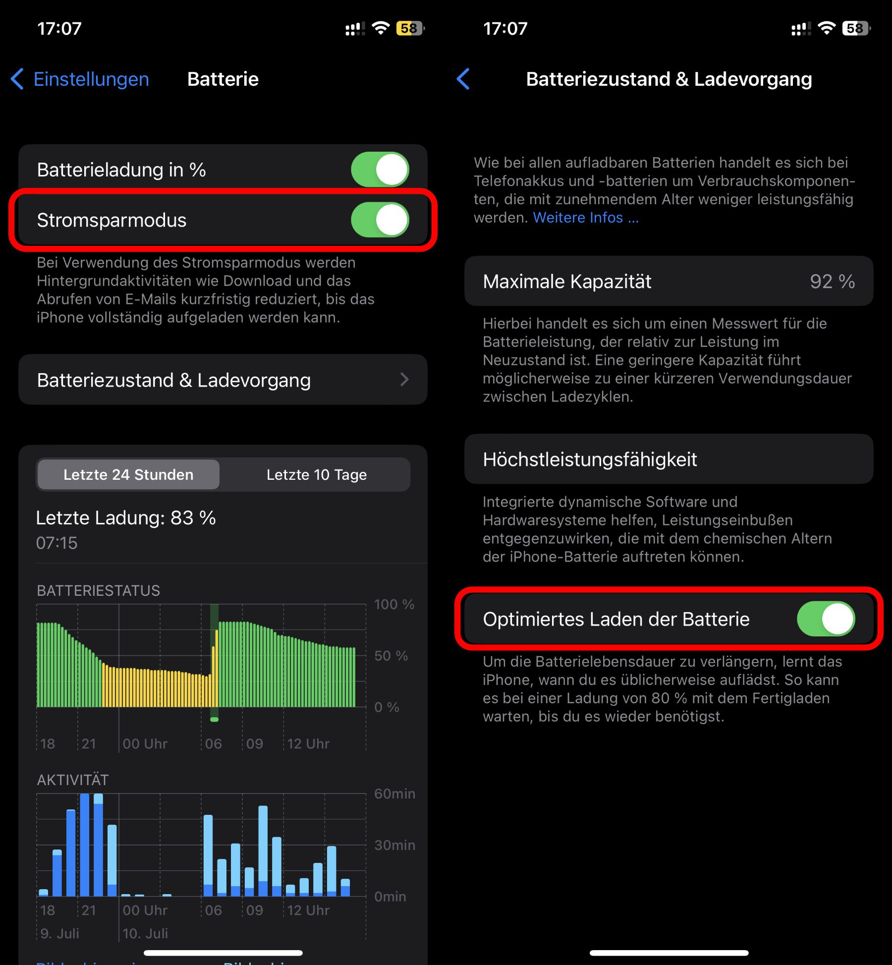 Wenn ihr den Akku in eurem Apple iPhone so lange wie möglich auf einem hohen Kapazitätslevel halten wollt, empfehle ich euch, in den oben gezeigten Einstellungen den Regler bei „Optimiertes Laden der Batterie“ zu aktivieren (s. Screenshot). Dann lädt der Akku über 80% langsamer, auch bei starken Ladegeräten, was der Gesundheit des Bauteils zugute kommt.