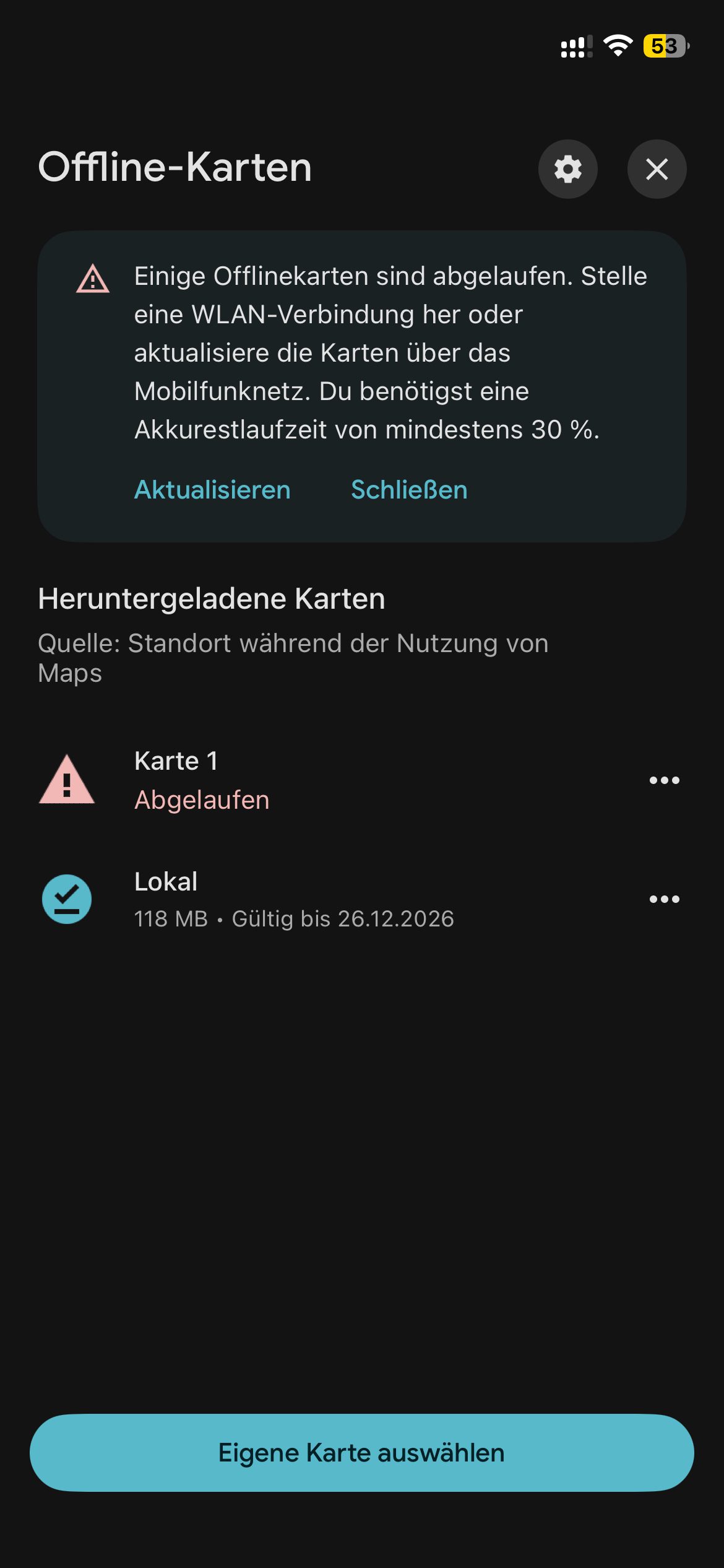 Aber als ich die App geöffnet hatte, gab es keinen Hinweis auf den Grund der Benachrichtigungsanzeige. Kein roter Punkt, kein hervorgehobenes Element, nichts deutete auf die Ursache hin. Also habe ich tiefer gegraben und bin in alle möglichen Menüs gegangen. Letztendlich habe ich die Lösung für das Problem im Offline-Kartenmaterial gefunden. Eine der Offline-Karten war nicht mehr aktuell und entsprechend gekennzeichnet.