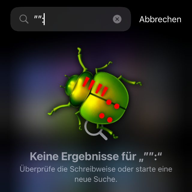 Laut einer Meldung von User @kpwn@infosec.exchange auf Mastodon sollte man, wenn man nach den Home-Screens weiter nach links zur App-Mediathek wischt, in der Suchleiste derselben nicht die Zeichenkombination "":: eingeben. Denn dies soll den Home-Bildschirm des Geräts abstürzen lassen. Das ist nicht sonderlich schlimm, da man nach einer kurzen Ladezeit nur zum Sperrbildschirm geschickt wird und der Home Screen direkt wieder nutzbar ist. Dennoch gilt: Ausprobieren auf eigene Gefahr!