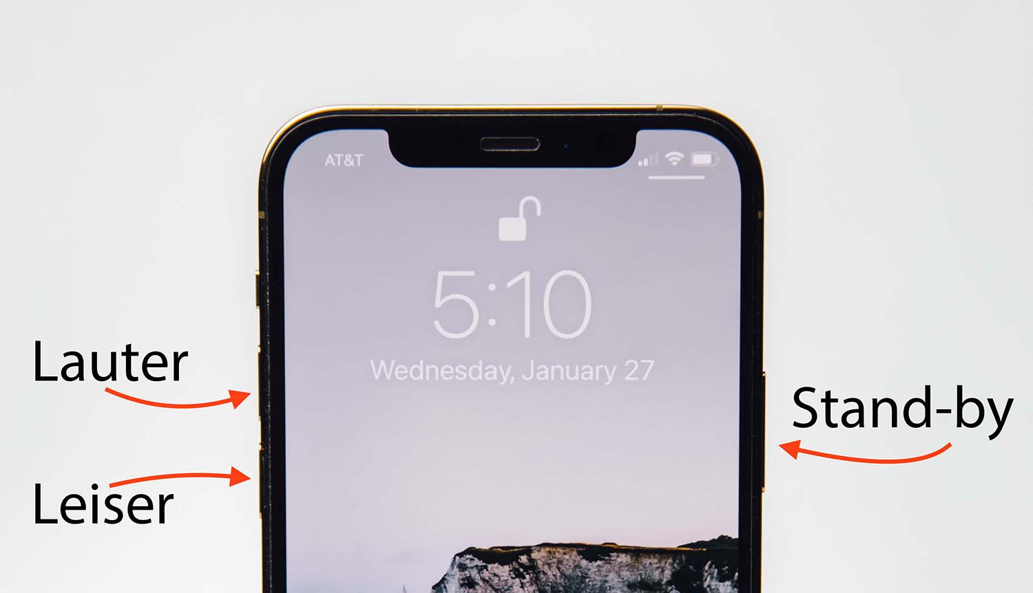- Taste links unten (Leiser-Taste) und Seitentaste rechts lange gedrückt halten