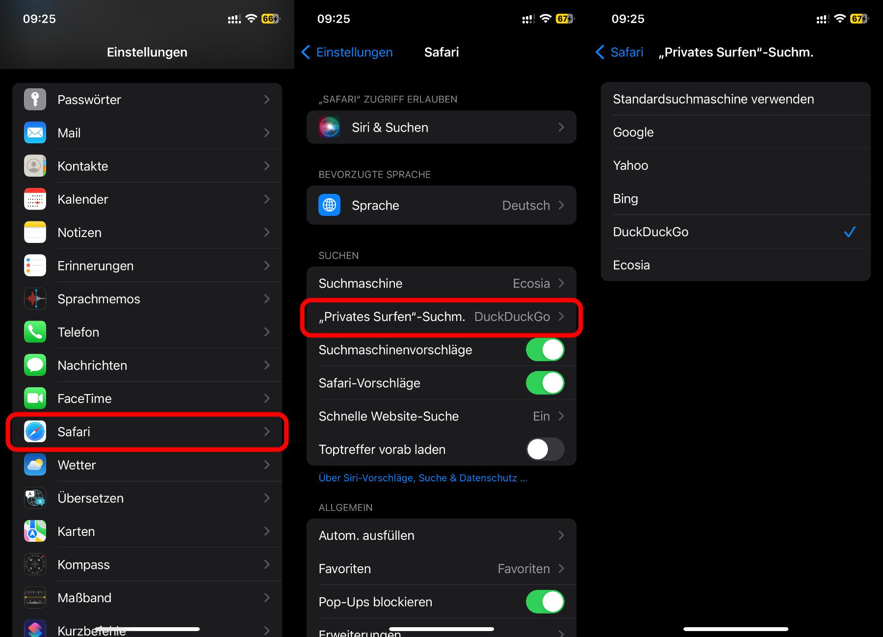 Wie ihr auf den obigen Screenshots vielleicht schon erkannt habt, könnt ihr auf diesem Weg auch die Suchmaschine festlegen, die standardmäßig für Anfragen in regulären Safari-Tabs verwendet werden soll. Die Schritt-für-Schritt-Anleitung dafür sieht also ganz ähnlich aus: