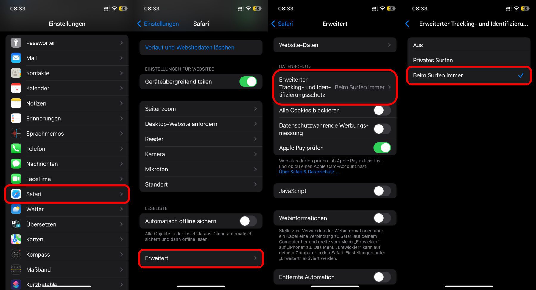 - Tippt unter „Datenschutz“ den Punkt Erweiterter Tracking- und Identifizierungsschutz an