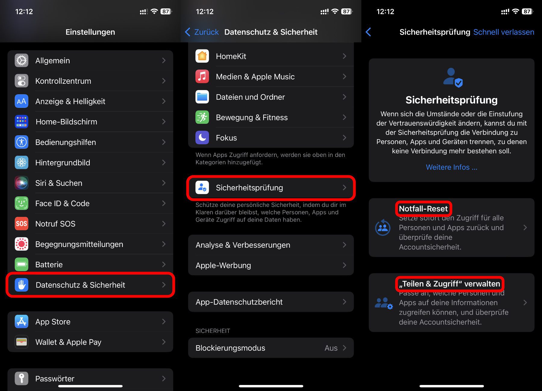 Die einzelnen Schritte des Safety Check am iPhone