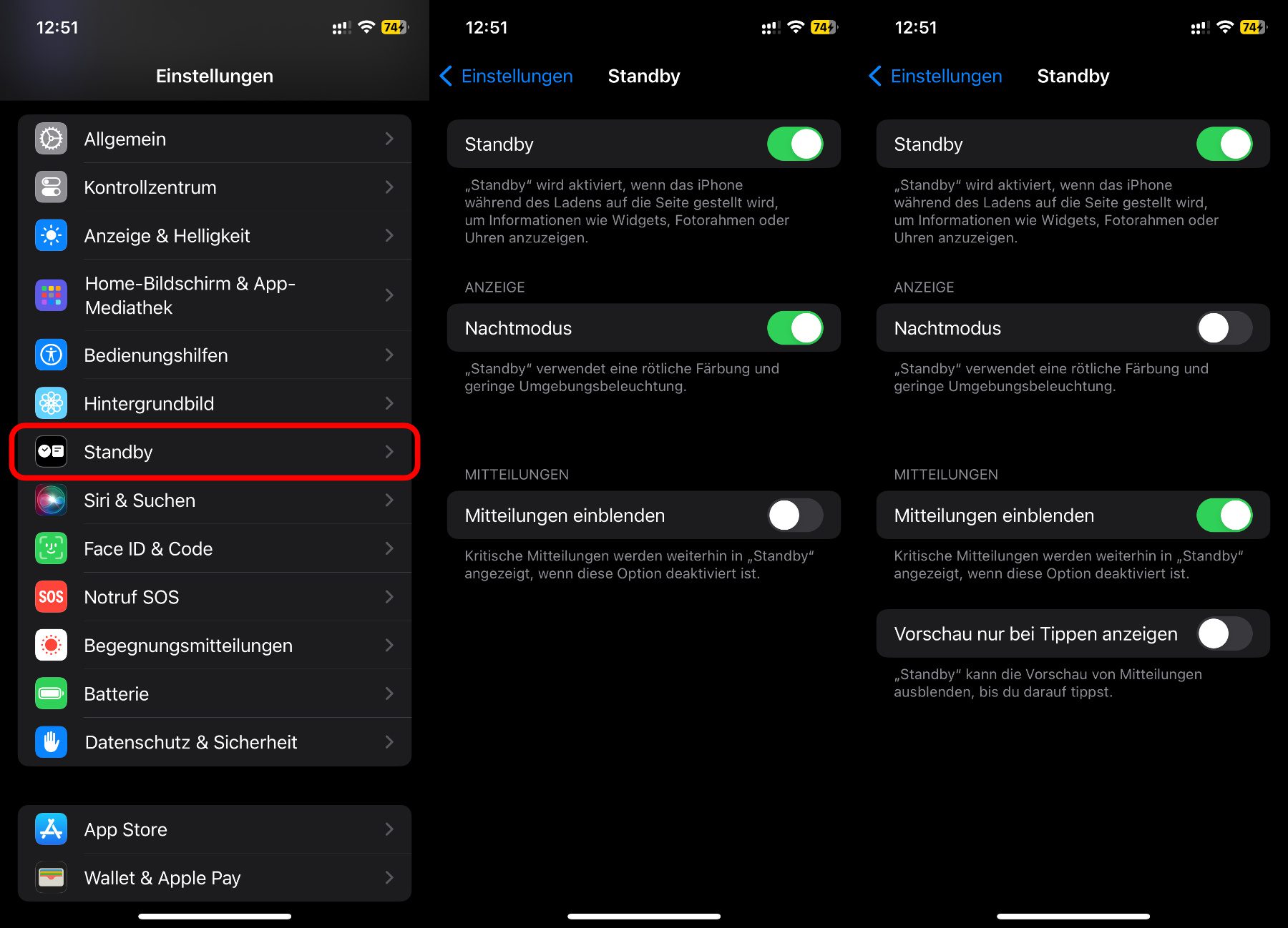 Wie ihr auf den Screenshots seht, gibt es im aufgezeigten Menü noch weitere Schalter. Den „Nachtmodus“ solltet ihr aktivieren, wenn ihr StandBy auf dem Nachttisch verwenden wollt. Dank ihm wird die Anzeige gedimmt sowie monochrom mit roten Inhalten auf schwarzem Hintergrund dargestellt. So wird man nicht geblendet, wenn man im Dunkeln nach der Uhrzeit schaut. Den dritten Schalter würde ich für die Nachttisch-Nutzung deaktivieren, denn wer will zur Schlafenszeit schon von Mitteilungen gestört werden? Andersherum, also ohne Nachtmodus und mit Mitteilungen, könnte man StandBy z. B. im Büro oder Wohnzimmer nutzen.