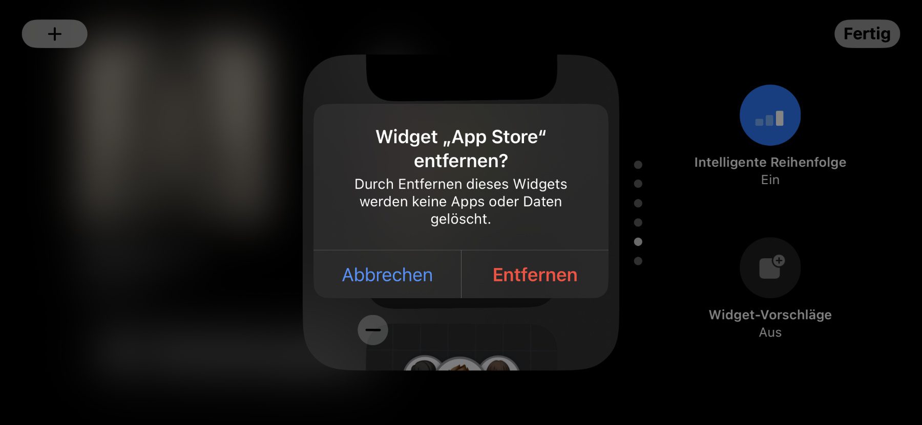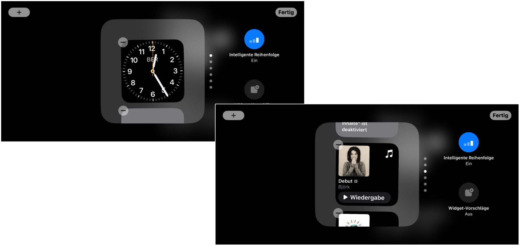 Nun könnt ihr aus einer vorgefertigten Liste aus Widgets auswählen oder über das Plus-Symbol (+) oben links weitere Inhalte hinzufügen. Vermittels des Minus-Symbols (–) an den Widgets in der Liste könnt ihr sie übrigens entfernen. Habt ihr die benötigten Inhalte zur Liste hinzugefügt und die nicht benötigten entfernt, dann tippt ihr oben rechts auf „Fertig“. Auf dem StandBy-Bildschirm könnt ihr dann nach oben und unten wischen, um zwischen den Widgets und App-Informationen zu wechseln.