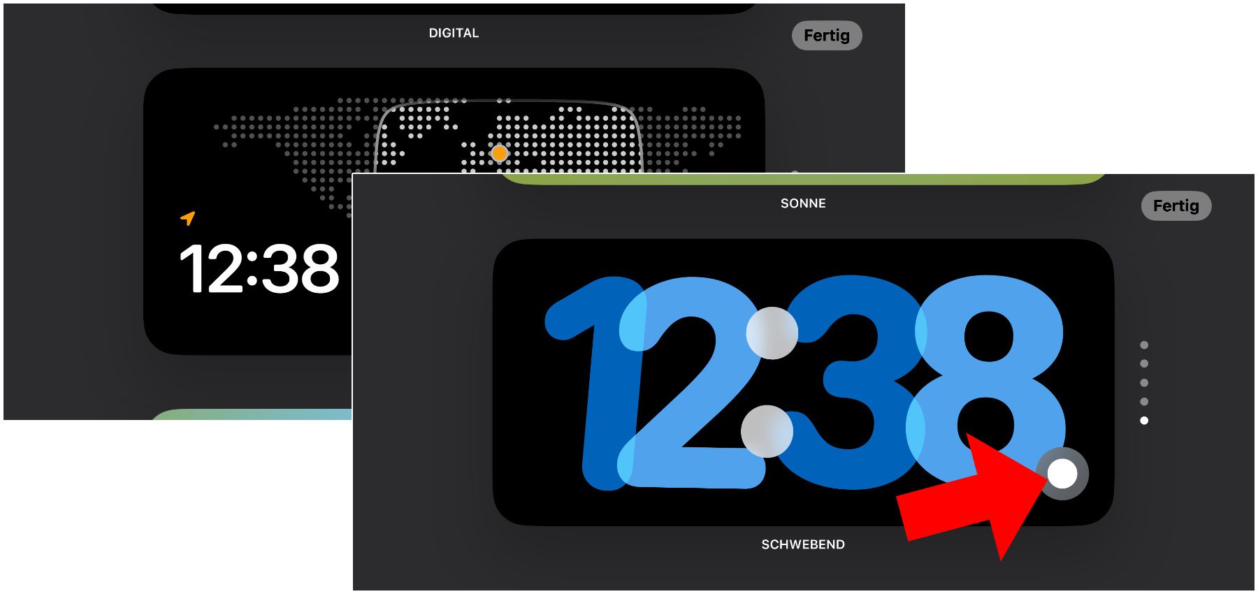 – Uhr-Widget anpassen: Sperrbildschirm > Anpassen und Uhrstil „Rounded“ (analog) wählen