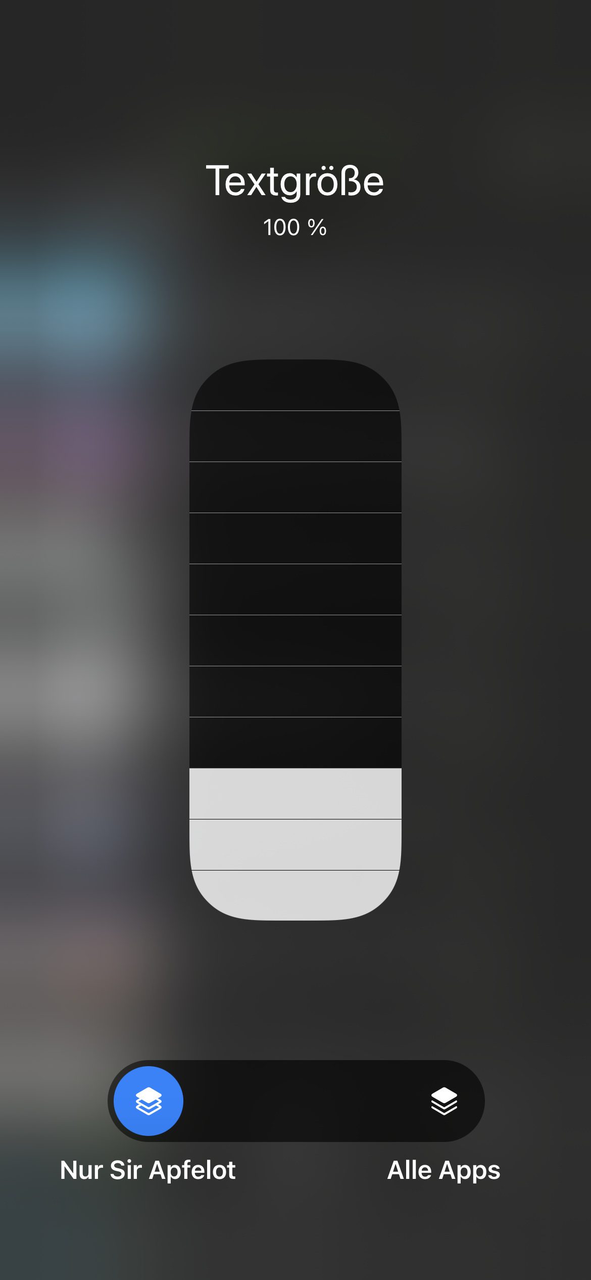 Nun könnt ihr die Schrift in jeder App individuell anpassen. Öffnet dazu das fragliche Programm (etwa Notizen, Safari, Nachrichten, Erinnerungen, Wetter, Fotos, Sir Apfelot oder alle anderen) und wischt anschließend mit einem Finger von der oberen rechten Ecke nach unten. Im so aufgerufenen Kontrollzentrum findet ihr nun die Kachel mit dem doppelten A. Tippt darauf und schon erscheint ein Regler für die Textgröße. Darunter könnt ihr auswählen, ob die eingestellte Schriftgröße sich nur auf die im Hintergrund offene App auswirken soll oder ob sie für alle Apps übernommen werden soll. Viel Spaß beim Ausprobieren!