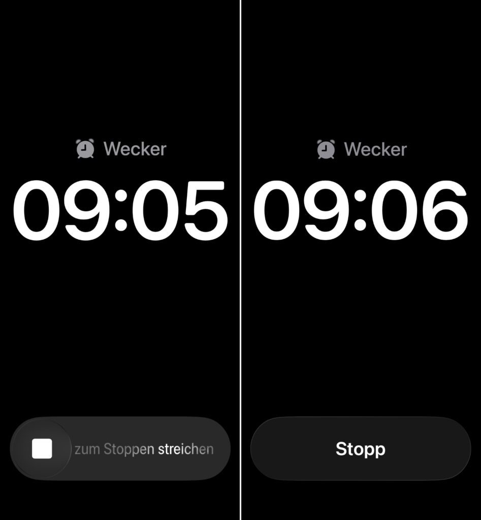 Vergleich: iPhone-Wecker mit deaktiviertem Stopp-Schieber