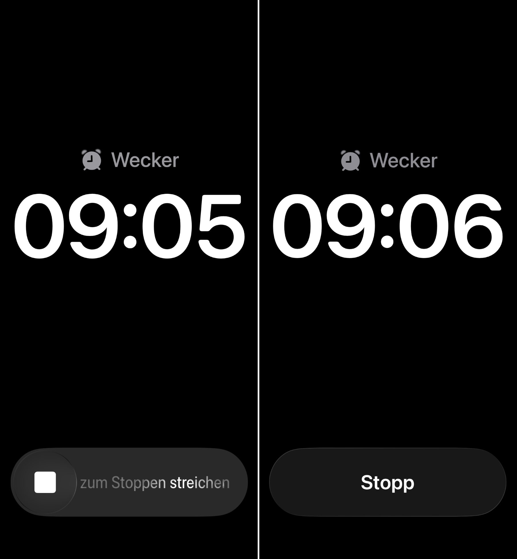 Im Folgenden habe ich zwei Screenshots gegenübergestellt. Links ist der iPhone-Wecker mit der neuen, in iOS 26.1 eingeführten Schieber-Funktion zu sehen. Rechts ist der Weckruf nach der Aktivierung der „Einzeltippaktionen bevorzugen“-Bedienungshilfe zu sehen. Auf beiden gibt es keine Schlummern-Taste, da ich diese Funktion in den Einstellungen der Weckzeit ausgeschaltet hab.