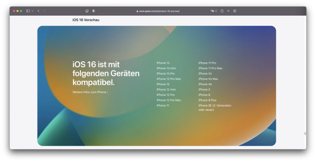 Welche iPhone-Modelle bekommen iOS 16 als Upgrade? In der obigen Liste findet ihr die ausführliche Antwort auf diese Frage. Die Quelle dafür ist die offizielle Preview-Seite zum kommenden iPhone-Betriebssystem von Apple. Neben dieser Aufzählung findet ihr aber auch alle Neuerungen und aktualisierten Features mit kurzen Beschreibungen, Screenshots und Animationen dort. Wie jedes Jahr könnt ihr euch also auf verschiedenen Wegen vor dem Upgrade einen Einblick davon verschaffen, was euch mit dem neuen iPhone-System erwartet – per Preview-Webseite, vermittels der WWDC-Keynote, über die Beta-Versionen und so weiter. Viel Spaß!