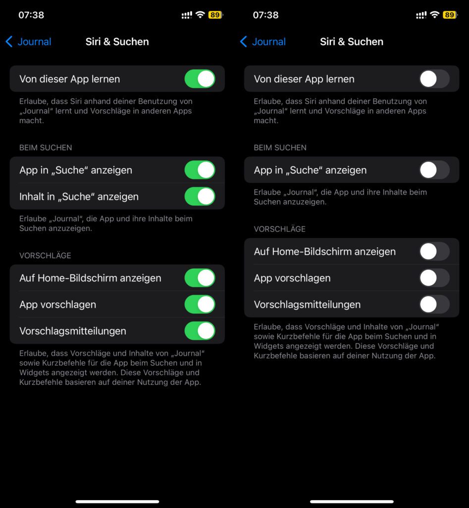 In der oben gezeigten Übersicht solltet ihr direkt den ersten Punkt „Siri & Suchen“ antippen. Falls ihr nämlich nicht wollt, dass Siri auf eurem Gerät mit Journal-Inhalten trainiert wird, dann gilt es hier, den entsprechenden Schalter zu deaktivieren. Außerdem werden Journal-Inhalte nur dann aus Suchergebnissen und Widgets herausgehalten, wenn ihr die dazugehörigen Schalter ebenfalls ausgraut.