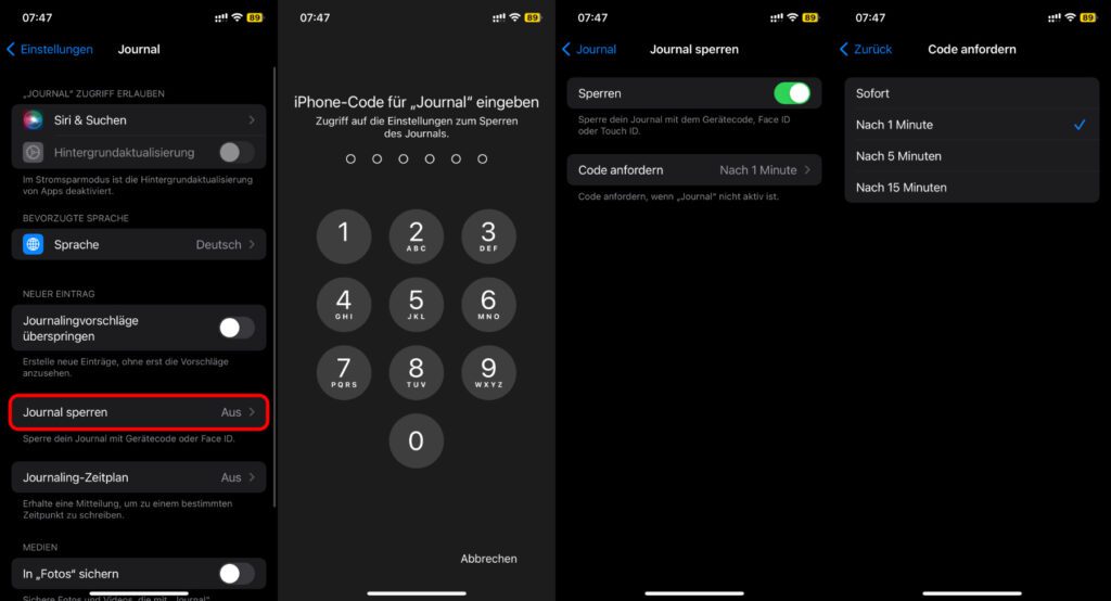 Wenn ihr eure Journal-Eintragungen so geheim wie ein analoges Tagebuch halten wollt, dann schaut zudem nochmal auf die vorige Seite (Einstellungen -> Journal). Hier könnt ihr nicht nur die Journalingvorschläge aktivieren und deaktivieren, sondern auch euer Journal sperren. Diese Option ist standardmäßig deaktiviert. Um die Sperre zu aktivieren, tippt den Menüpunkt an, gebt euren Gerätecode ein und stellt dann die Journal-Sperre mit Face ID, Touch ID und / oder Gerätecode ein.