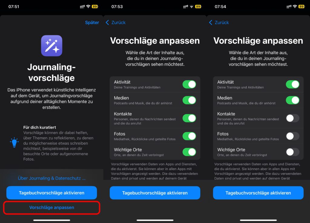 Mit Journal bietet Apple eine hauseigene Möglichkeit an, auf dem iPhone ein Tagebuch zu führen. Dafür werden zwar – bei Aktivierung der entsprechenden Optionen – zahlreiche Daten und Informationen abgerufen, das alles ist aber abgesichert. Wer der Sache dennoch nicht so ganz traut, kann einzelne Datenzugriffe unterbinden. Zum Zweck der schnellen Journaling-Prompts hat Apple einige Optionen standardmäßig aktiviert, sodass man zur Unterbindung aktiv werden und die aufgezeigten Bereiche der Geräteeinstellungen aufrufen muss. Habt ihr noch Fragen oder Anmerkungen dazu, dann lasst gern einen Kommentar da :)