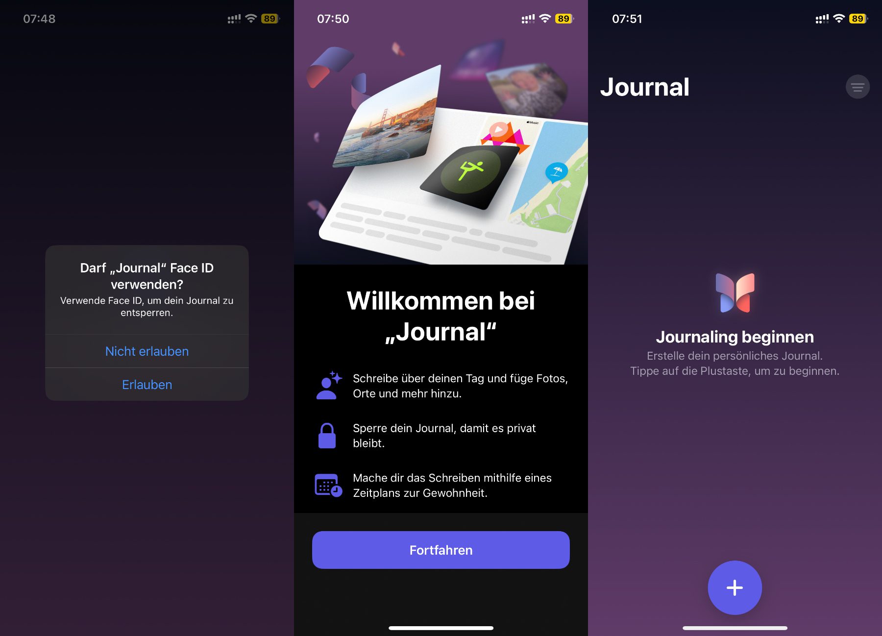Die allererste Entscheidung ist bereits beim ersten Öffnen der Journal App zu treffen. Es wird nämlich nachgefragt, ob Face ID oder Touch ID zum Entsperren genutzt werden dürfen. Wenn ihr lediglich den Gerätecode nutzen wollt, dann lehnt dies ab. Wollt ihr die biometrische Entsperrung aktivieren, dann stimmt dieser Einstellung mit „Erlauben“ zu.