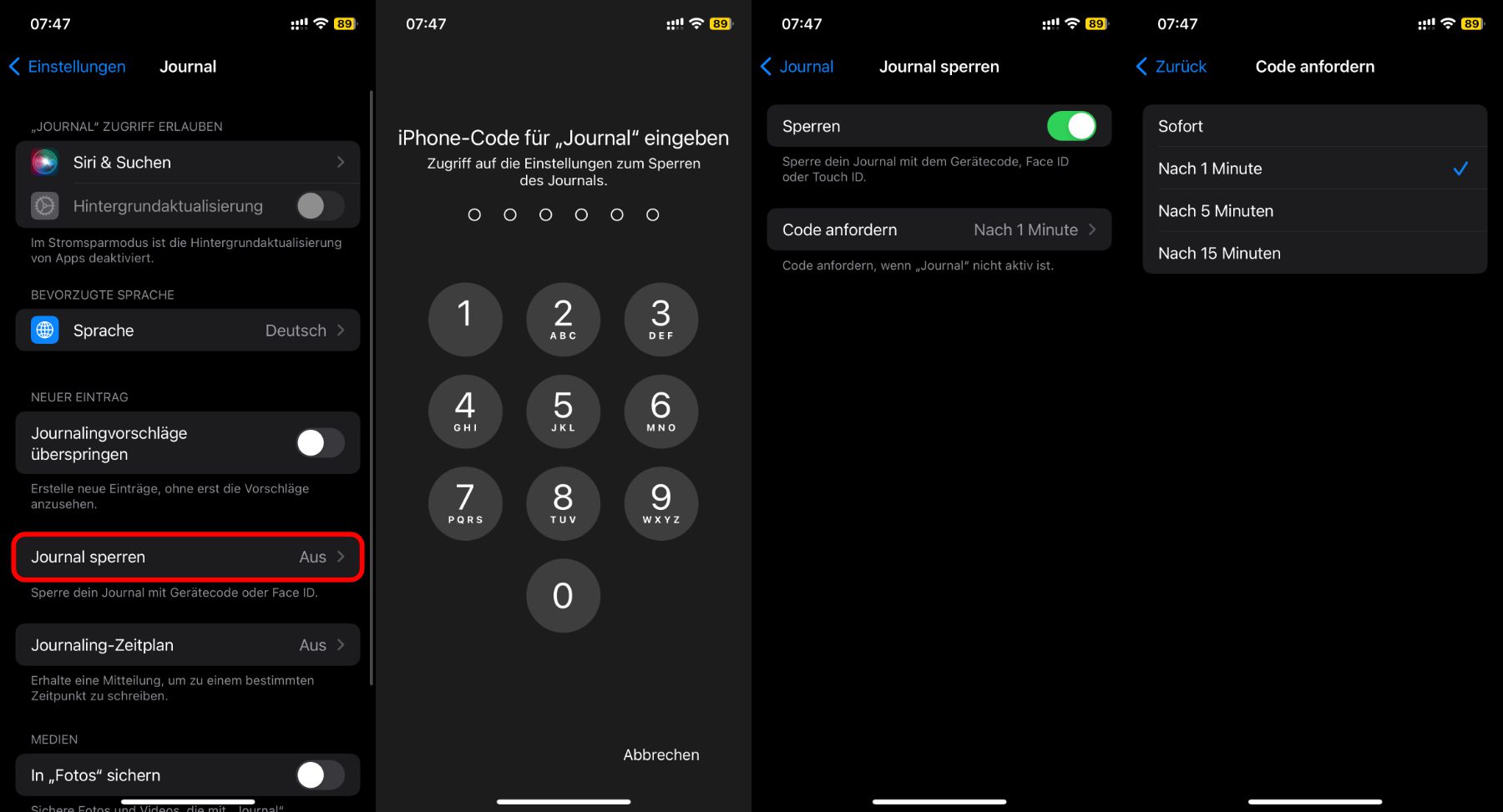 Wenn ihr eure Journal-Eintragungen so geheim wie ein analoges Tagebuch halten wollt, dann schaut zudem nochmal auf die vorige Seite (Einstellungen -> Journal). Hier könnt ihr nicht nur die Journalingvorschläge aktivieren und deaktivieren, sondern auch euer Journal sperren. Diese Option ist standardmäßig deaktiviert. Um die Sperre zu aktivieren, tippt den Menüpunkt an, gebt euren Gerätecode ein und stellt dann die Journal-Sperre mit Face ID, Touch ID und / oder Gerätecode ein.