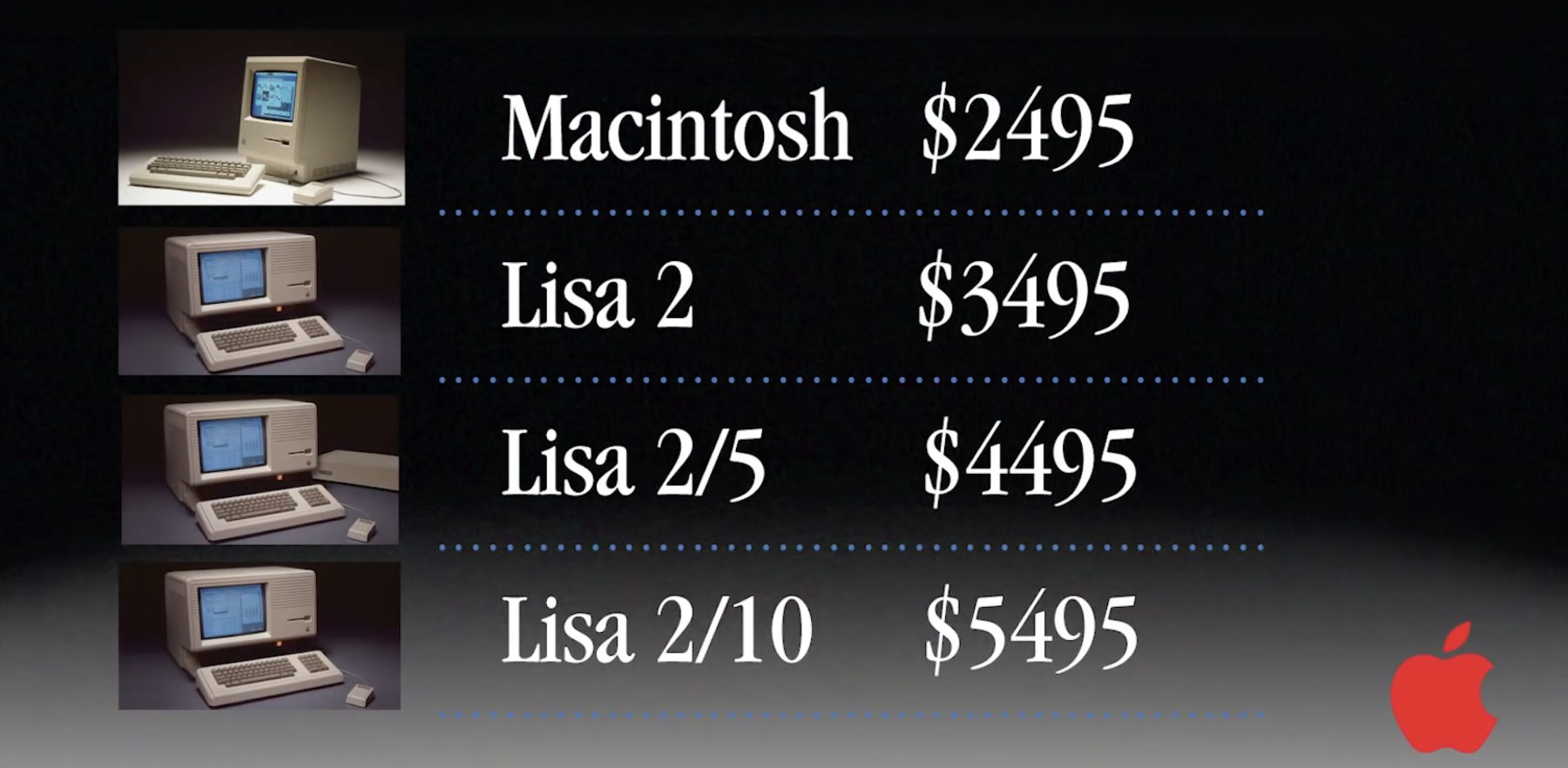 Am 24. Januar 1984 war es dann soweit. Mit einer umfangreichen Bühneninszenierung stellte Steve Jobs den neuen Macintosh vor. Neben einer Vorführung der Hard- und Software wurde dabei auch der Preis bekanntgegeben. Interessant daran ist, dass man den Preis so weit drücken konnte, dass er $1000 unter dem des Apple Lisa 2 lag. Während letzterer mit 3.495 US-Dollar zu Buche schlug, konnte man den Macintosh bereits ab 2.495 US-Dollar haben. Neben der Macintosh-Entwicklung an sich brachte auch diese interne Preiskonkurrenz jene Spannungen ins Unternehmen, die schließlich zu Steve Jobs’ Rausschmiss führten.