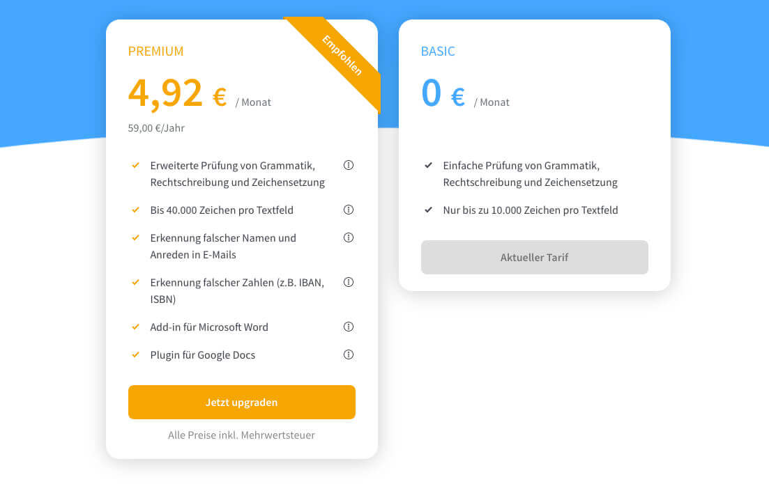 Der Premium-Account von LanguageTool kostet derzeit ca. 5 Euro im Monat, wenn man die jährliche Zahlung wählt.