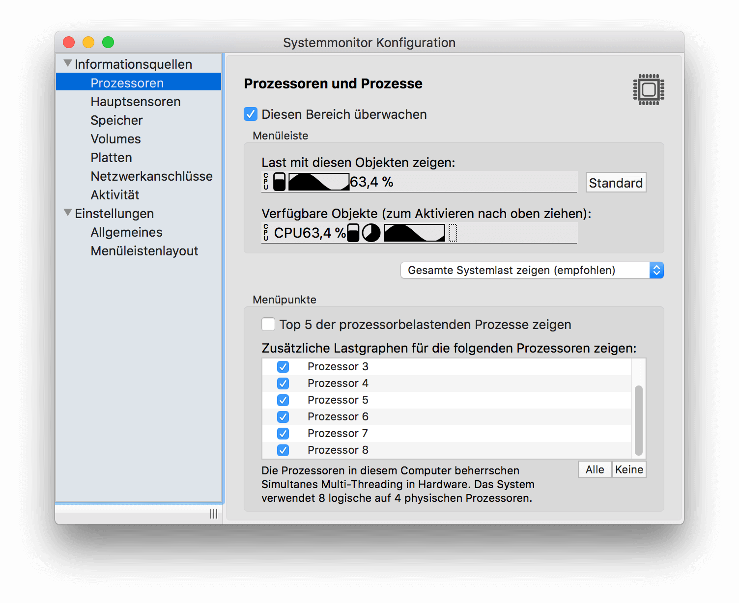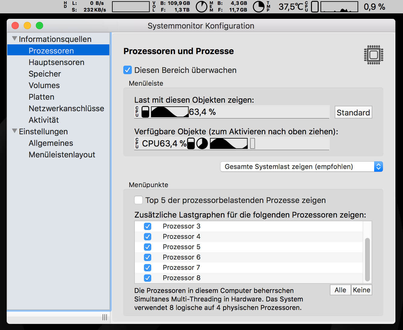 Sowohl für Mac OS X / macOS als auch für Windows in seinen verschiedenen Versionen gibt es Apps, mit denen man die Auslastung des Systems, der Prozessoren, Festplatten, der Grafikkarte und Co. auslesen kann. Ein Standardwert beim Auslesen solcher Daten ist auch die CPU-Temperatur. Eine App für die Menüleiste von macOS heißt einfach nur „Systemmonitor“. Die Demo-Version könnt ihr beim Entwickler kostenlos herunterladen: bresink.com - die Vollversion gibt’s im App Store: