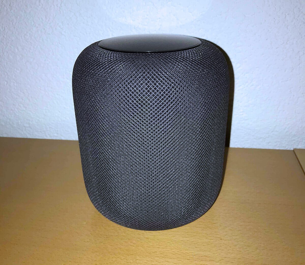 Das Geflecht, das den HomePod umgibt, ist bei weitem nicht so hart, wie ich es erwartet habe. Wenn man mit dem Finger drauf drückt, gibt es leicht nach. Das Bedienfeld an der Oberseite ist gut gelungen und praktisch (wie von Apple gewohnt), zumindest am Anfang ist es aber sicher hilfreich, wenn man den HomePod so aufstellt, dass die Oberseite zugänglich ist bzw. eingesehen werden kann.