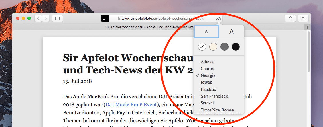 Um diesen Reader-Modus in Safari (klappt auch auf dem iPhone und iPad) aufzurufen, klickt ihr zum Beispiel bei diesem Artikel oben neben der Adresszeile auf das Symbol mit den waagerechten Linien. Wichtig anzumerken ist allerdings, dass dieser Modus nicht auf allen Webseiten zur Verfügung steht. Ist man zum Beispiel bei Sir Apfelot auf der Startseite, dann wird dieser Button für den Lesemodus garnicht erst angeboten. Vermutlich ist dies der Fall, da Safari erkennt, dass es sich hier nicht um einen einzelnen Artikel handelt.